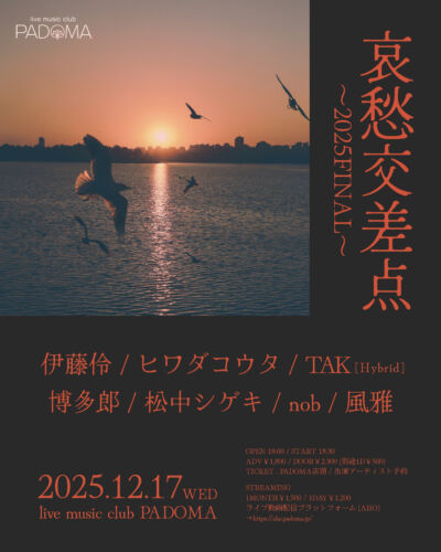 出演 : かとりょー(fr.尾道) / 松田規男[Paparazzi Panic] / 三杉知嘉良[asano raincoat] / イワタショウゴ / Hybrid[acoustic set] / 加藤英幸[pavlov] -