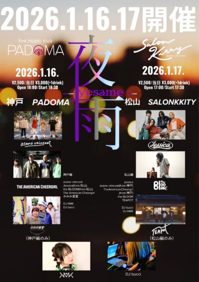 出演 : asano raincoat / アシガルユース / ハヤシライフ / Junk Unit / みみみ食堂 / 赤いアフロ / Jessica(fr.愛媛) / Shake Freaks / DJ : KMK from rendez-vous | Food : みふね農家のおにぎり屋さん -