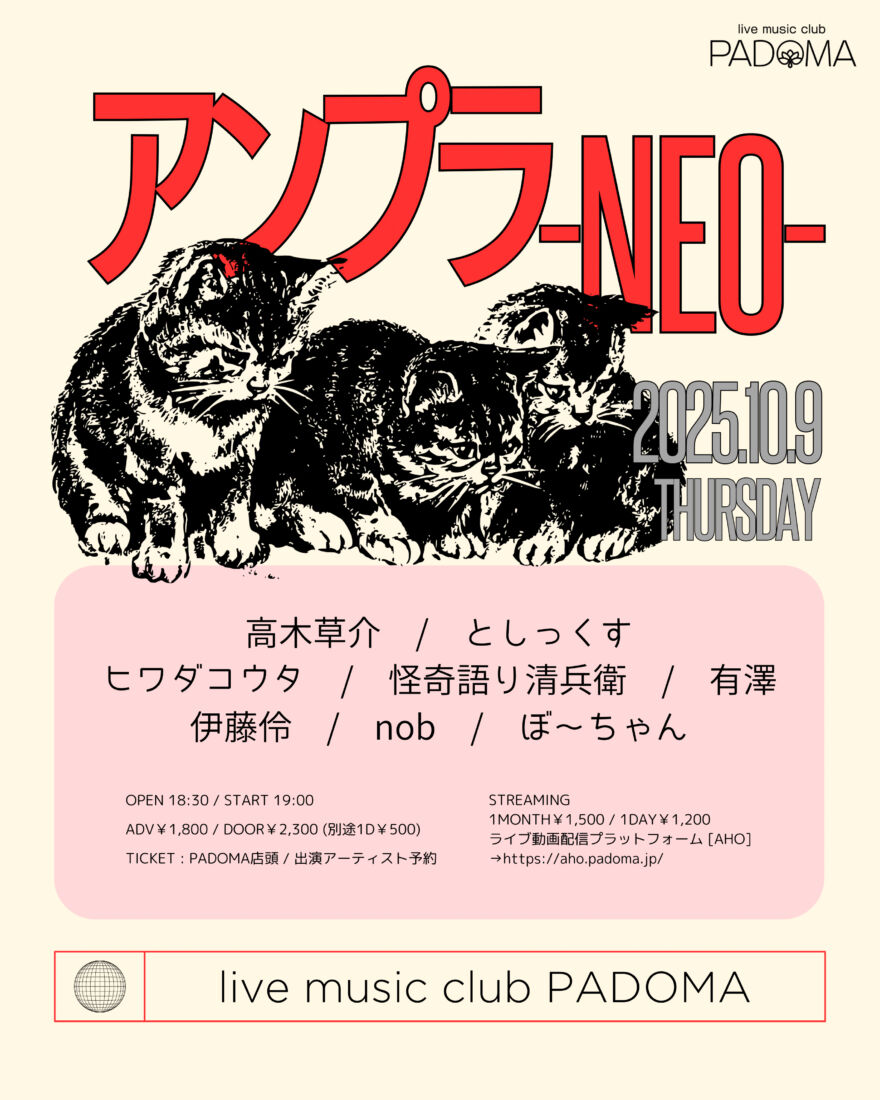 山下英将[folca] / 松山晃太 / 井上貴博 Gt.爲川裕也[folca] / ハクデンワモウ[オテモトチョップスティックス] / 三杉知嘉良[asano raincoat] / Caito[ex.devoir] / O.A : ねこむすめ | Food : HIDE'S Kitchen