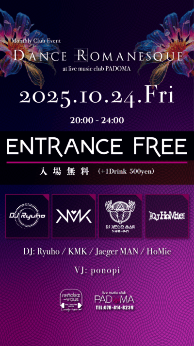 【DJs】 Ryuho / KMK / Jaeger MAN / HoMie | 【VJ】 ponopi